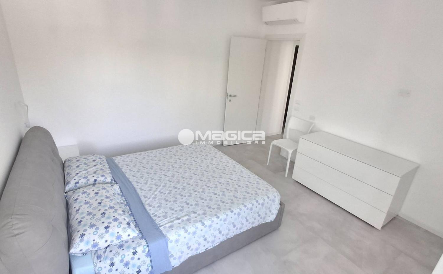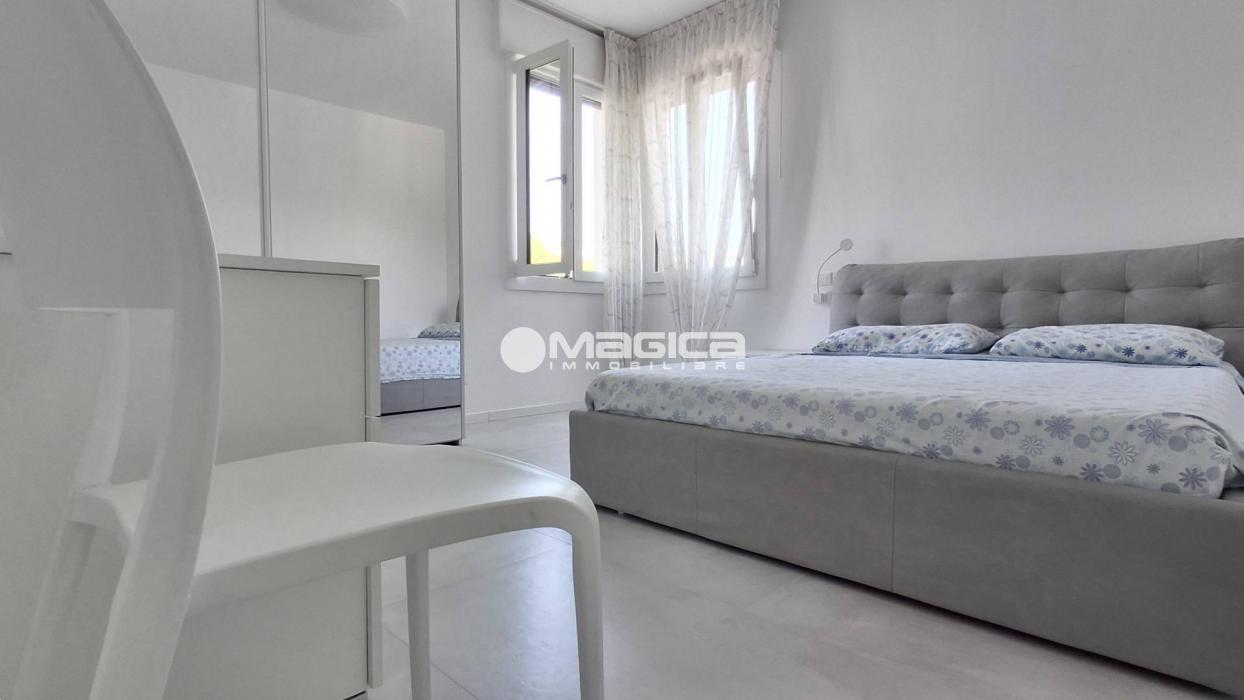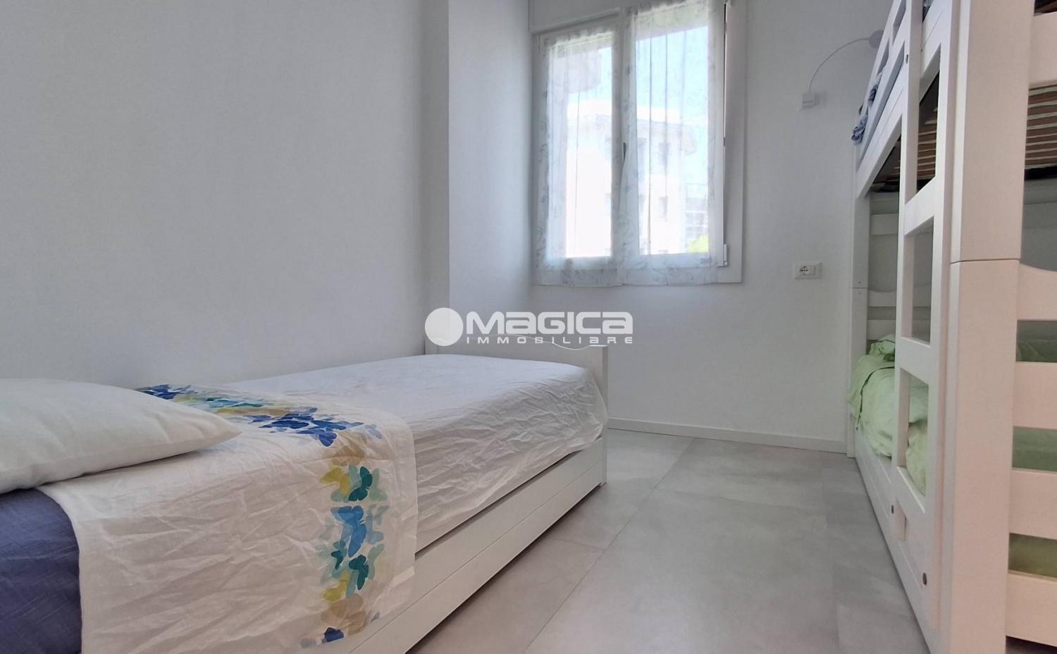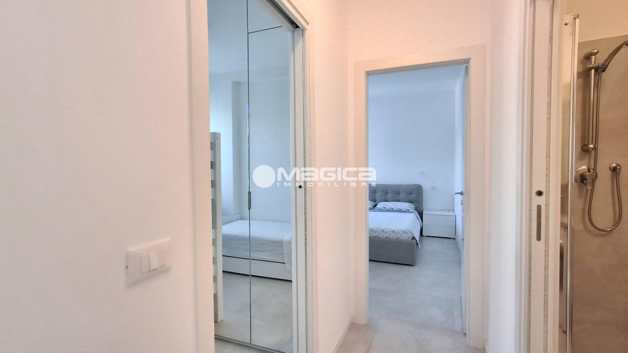 L'appartamento dispone di una camera da letto matrimoniale e di una stanza arredata con due letti singoli, perfetta per ospiti o bambini. Il bagno, dotato di doccia, è stato completamente rinnovato con impianti moderni. Ogni angolo è arredato in modo funzionale e moderno, creando un ambiente confortevole e accogliente.